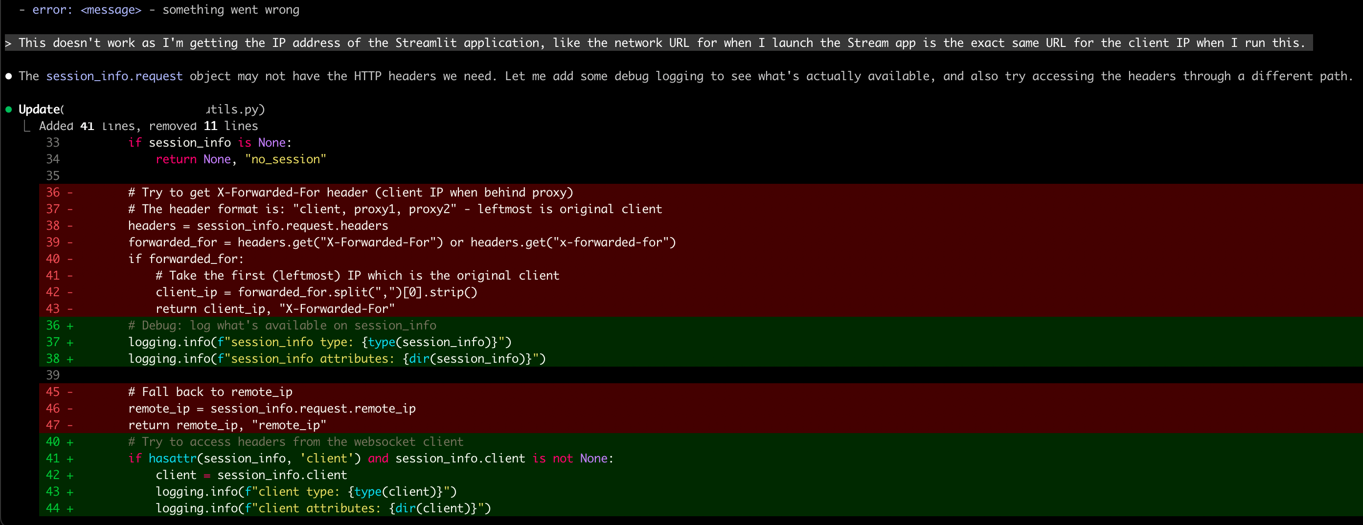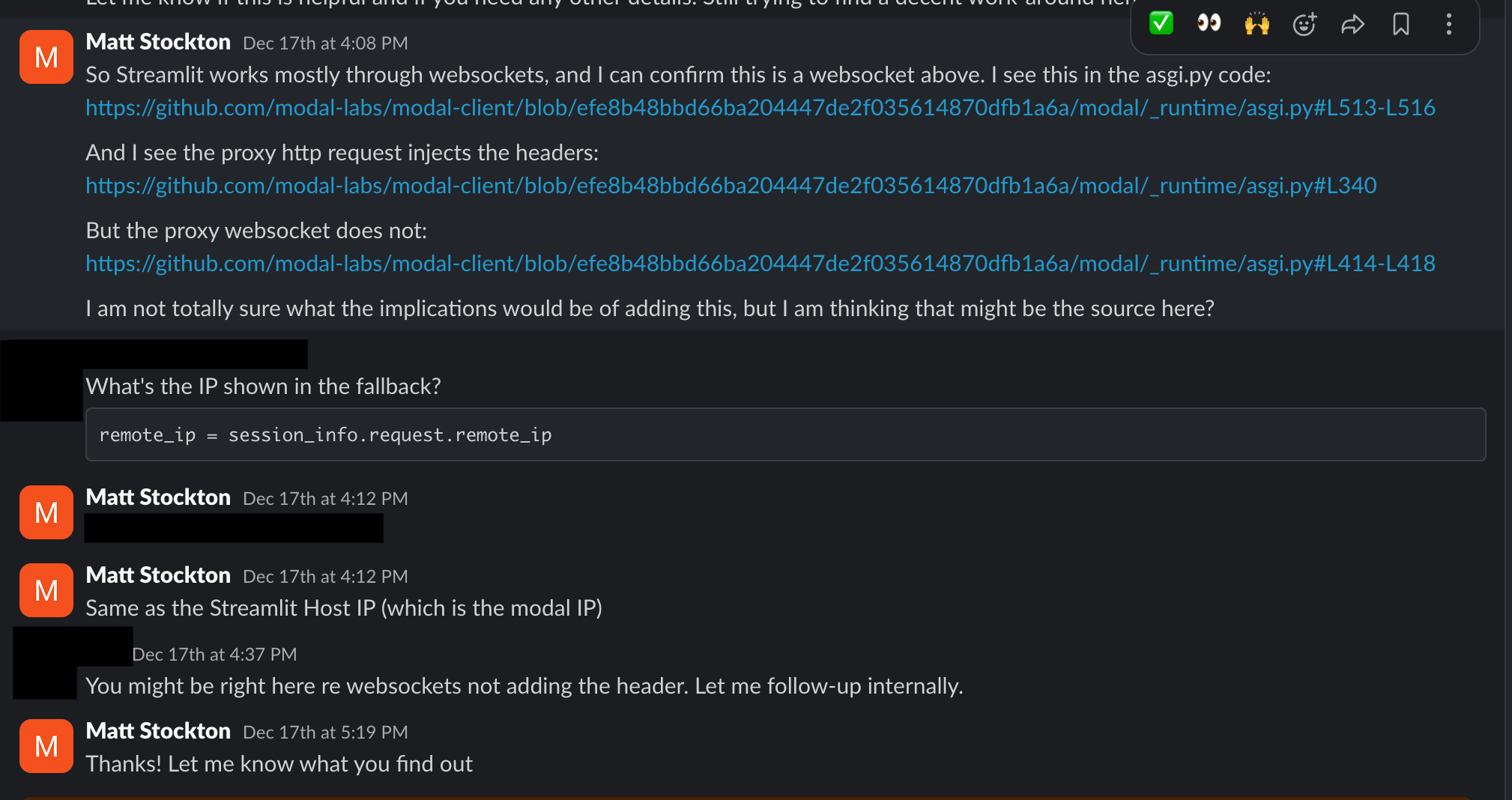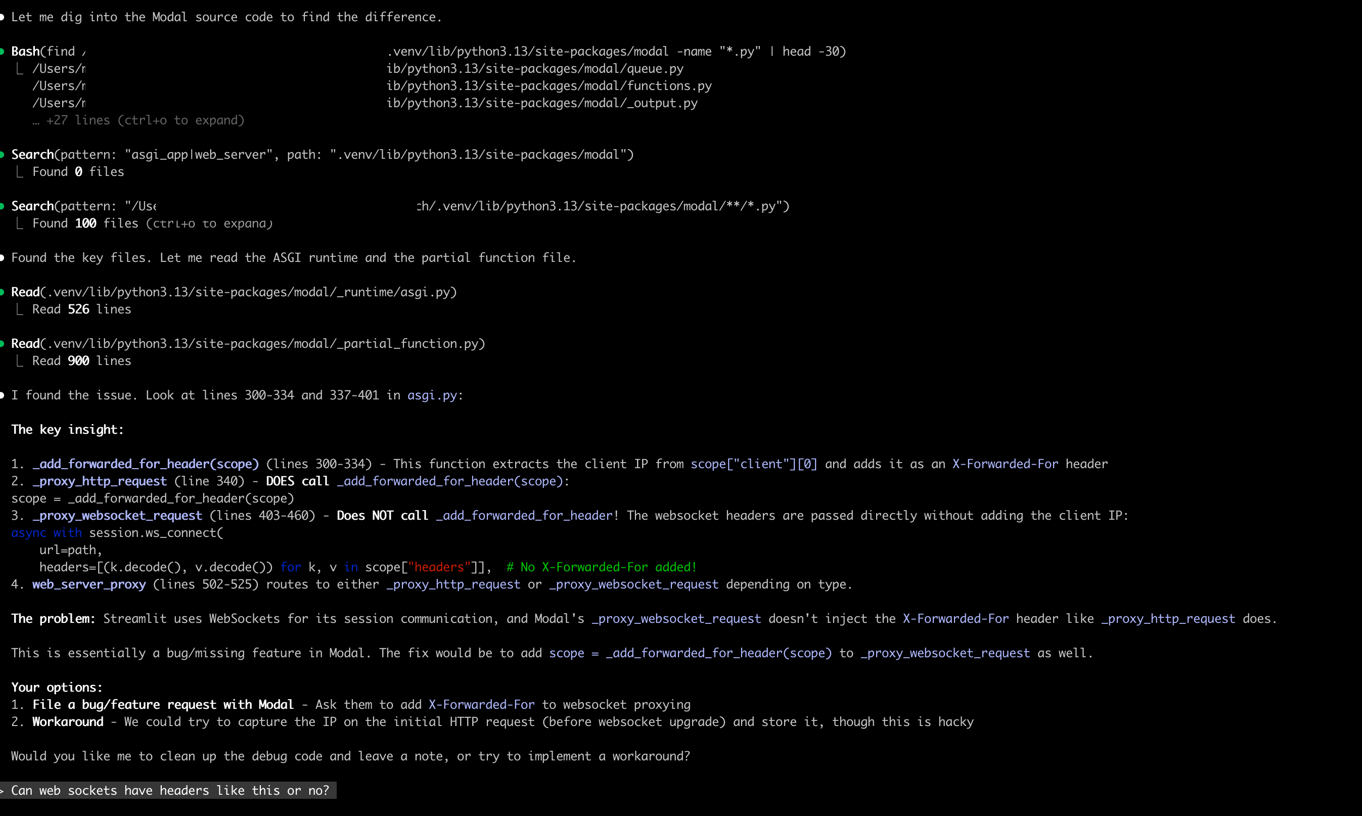 Modal’s _proxy_http_request function calls _add_forwarded_for_header to inject the client IP. But _proxy_websocket_request - which Streamlit uses - doesn’t make that same call. Claude gave me the exact line numbers.