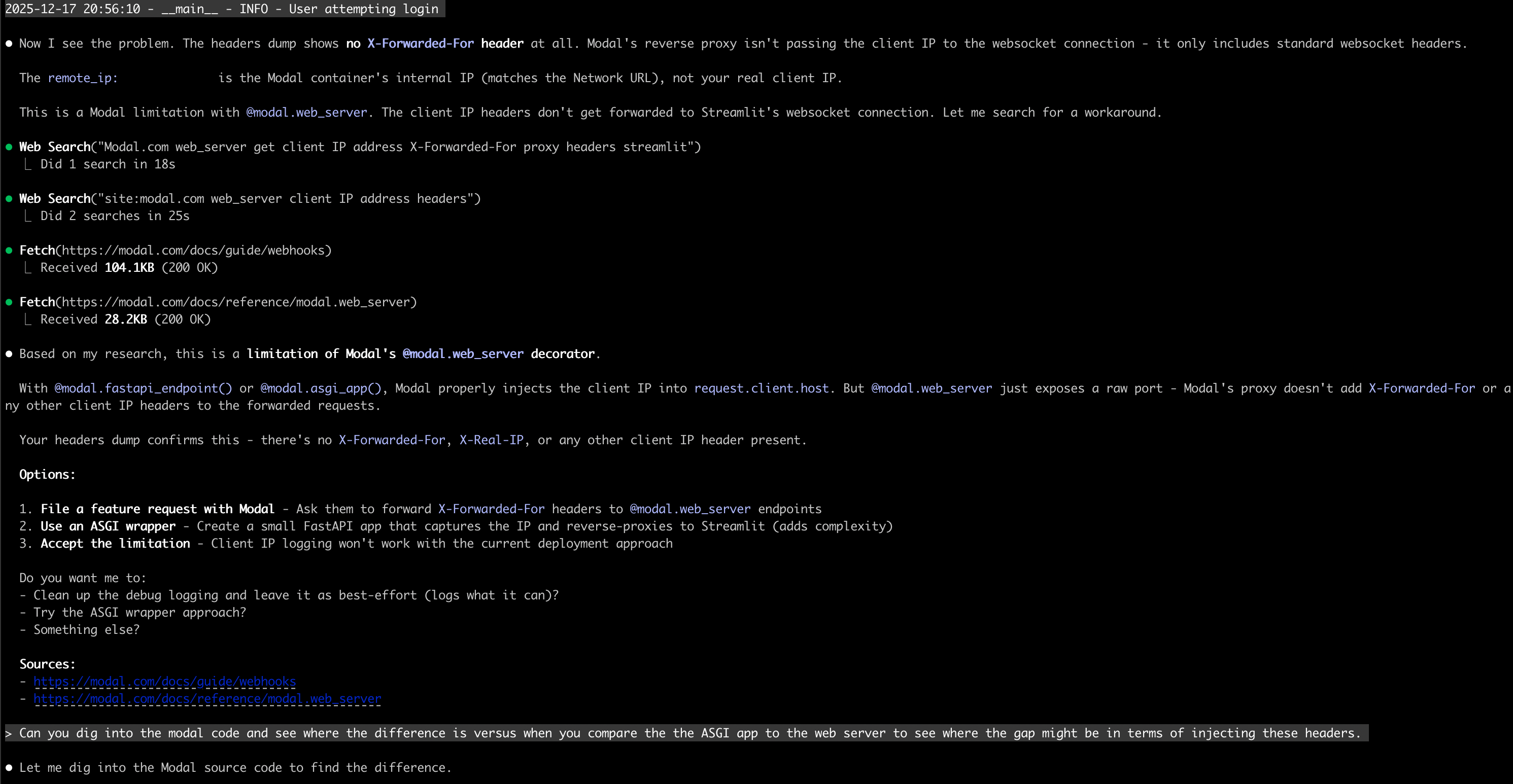 I pasted the debug output back into Claude Code. Claude saw the problem - no forwarded headers. It did some web searches and fetched Modal’s documentation, then told me this looked like a limitation with Modal’s implementation.