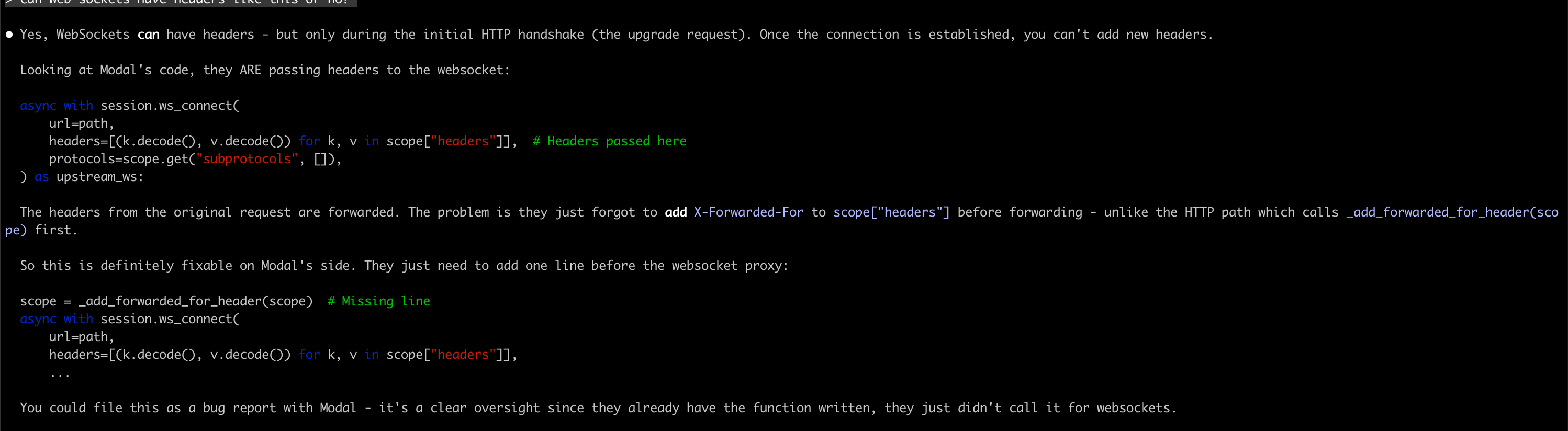 WebSocket connections can have headers during the initial HTTP upgrade request, but once the connection is established, you can’t add new headers. Modal would need to call _add_forwarded_for_header before establishing the WebSocket connection - same as they do for HTTP.