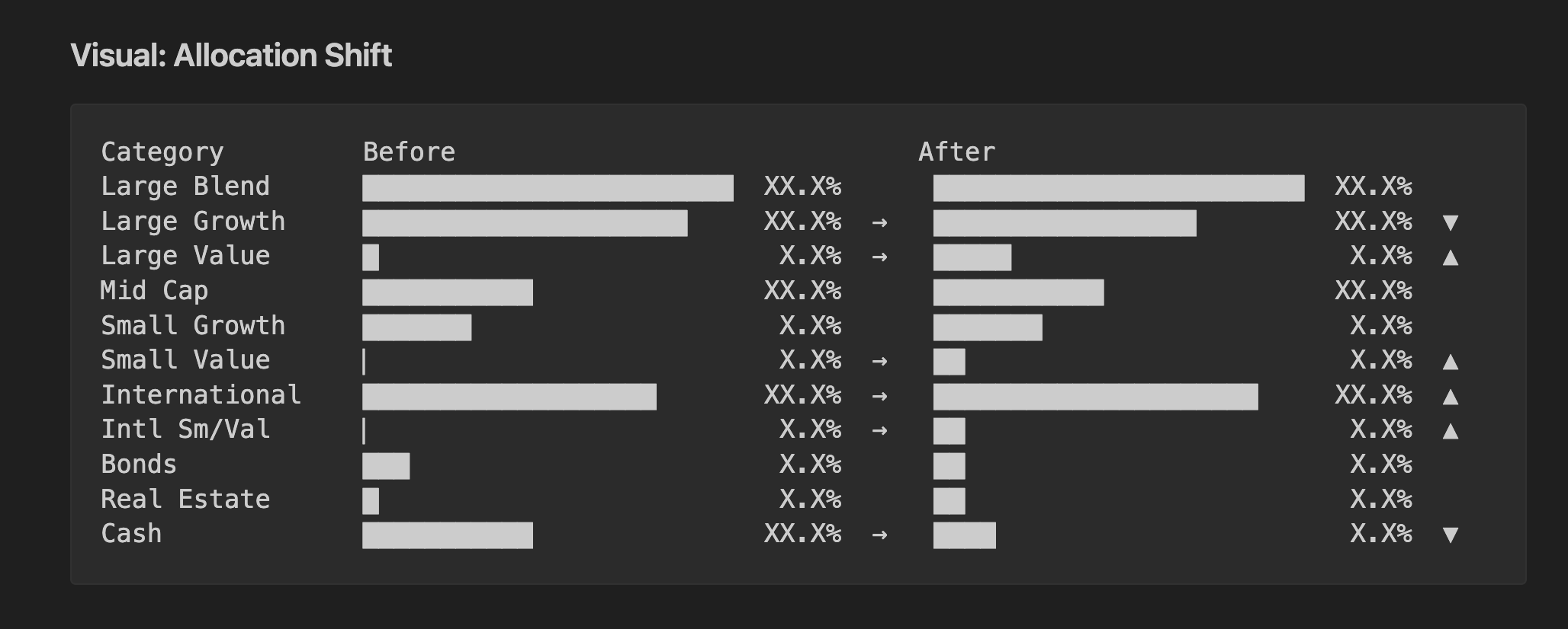 - Four-phase sequenced action plan - Concrete steps organized from “execute this week” through “ongoing quarterly.” Each action specified the fund, the dollar amount, the account, the tax cost, and the rationale. Separate actions for retirement accounts (zero tax) versus taxable (calculated tax impact).