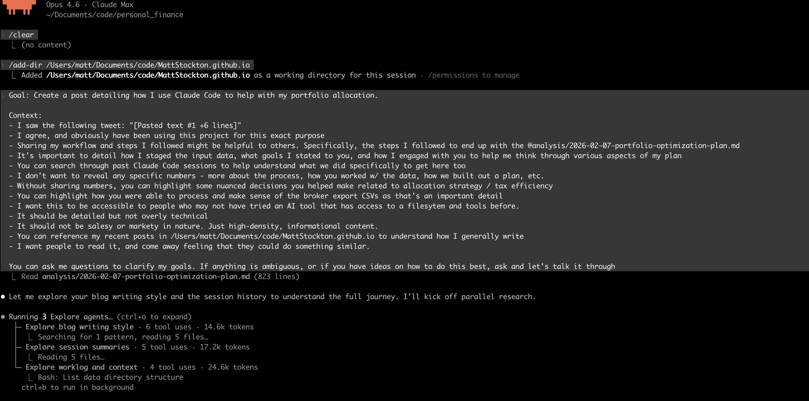 I used Claude Code, which runs in a terminal and can read and write files on your machine. I pointed it at a directory with all my financial data. Portfolio analysis is a good fit for this because there’s a lot of messy data in different formats that the model can just dig through directly.