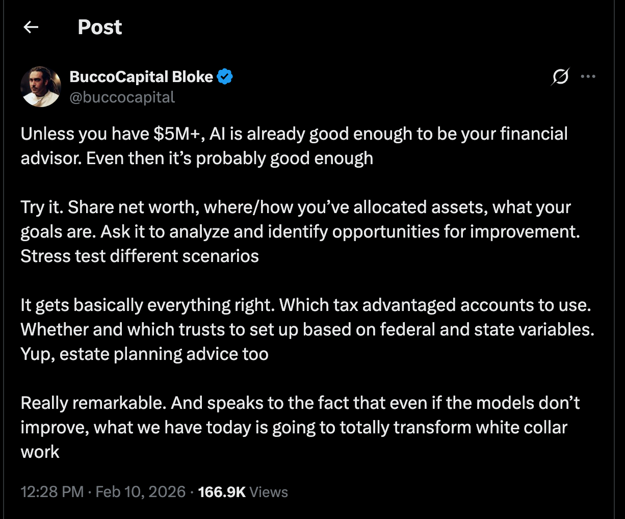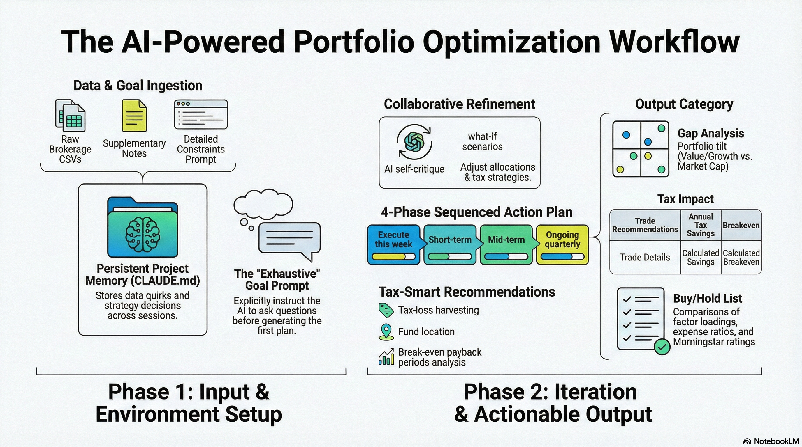 I saw the below tweet recently and I did exactly this. Over multiple sessions with Claude Code, I fed it our brokerage CSVs, described our goals and constraints, and worked with it to produce a portfolio optimization plan - phased actions, tax impact analysis, fund recommendations, before-and-after allocation grids. The kind of plan you’d pay a financial advisor to put together, except I built it with an AI.
